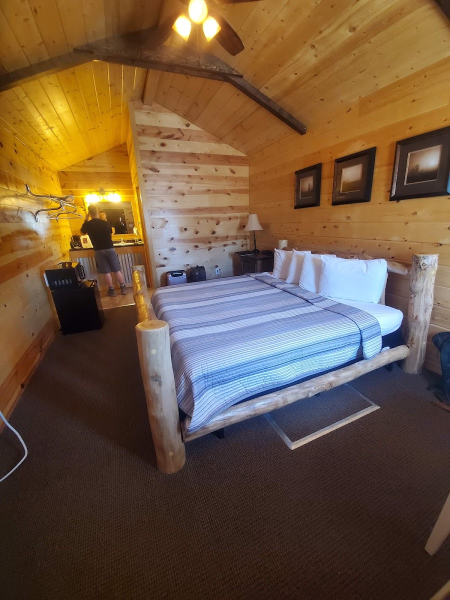 The cabin was cute with a nice deck out front that had 2 metal chairs and a metal table. You park right next to your cabin, which is nice. The bed was okay. The problem I had with the bed was that it really is high, and for someone who is short, it is really difficult to climb up to get in bed. The mattress seemed to do in the center so that you rolled to the middle during the night. There is only one chair inside, so someone has to sit on the metal chair from outside or climb up on the bed to sit. The heater was really loud and kept going on and off all night long. If you wanted to watch TV, you had to turn off the heater, or you couldn't hear the shows without turning the volume up really loud. The bathroom was nice, and the heater worked great. We didn't eat at the continental breakfast as the options were minimal, so we just went down the street to the Stage Stop Station. The cabin does have a mini frig and a microwave. The location is great for Bryce Canyon NP, Kodachrome Basin SP, and Grand Staircase-Escalante NM. For the price, it was fine.